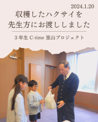 里山 613.収穫したハクサイを先生方にお渡ししました 2024年1月20日 2024年2月1日 小学部の教頭です。 3年生の児童から、収穫した白菜をいただきました。 普段の感謝の気持ちを贈り物に、ということで、理事長先生・校長先生・教学顧問先生にもお渡ししていました。 お店で売られている白菜よりも立派なもので、上手に育てたものだなと驚きました。 おいしくいただこうと思います。