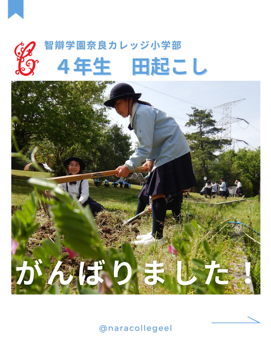 里山 629.College Time「田起こし」(4年生) 2024年4月29日 4年生が、田んぼの田起こしを行いました。 慣れない手つきで、鍬やスコップで土を掘り起こします。 「ミミズがいた!」「雑草の根っこ、すごい!」 自然とふれ合いながら、農作業に汗を流しました。 これから一年間、田んぼととも過ごしていく4年生。 美味しいお米が実るといいですね。...