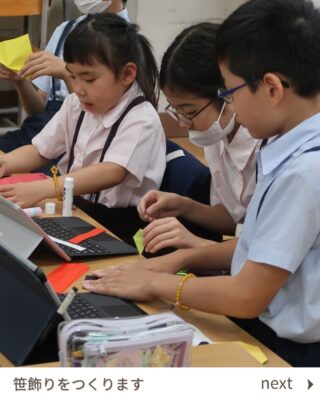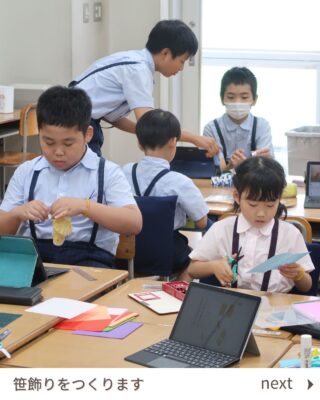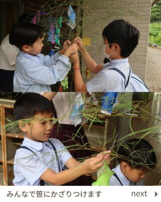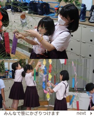 行事 671.七夕行事(1・6年生) 2024年7月11日 2024年7月25日 1年生と6年生が七夕行事を行いました。 6年生が笹飾りの作り方を1年生に教えて一緒に作ります。1年生はいろんな飾りを教えてもらい、とても楽しそうでした。 飾りができたら、短冊に願い事を書き、笹にかざりつけます。6年生は優しく丁寧に接してあげることができました。