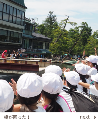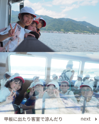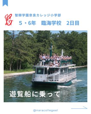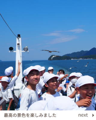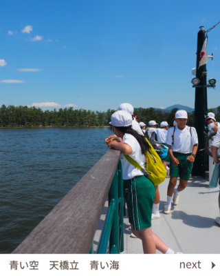 行事 675.遊覧船に乗って(5・6年生) 2024年7月17日 2024年7月27日 2日目の午後は遊覧船に乗って天橋立を見ながら阿蘇海のクルージングです。 かっぱえびせんを投げてみるとカモメやトンビがたくさん飛んできました。間近に迫るカモメにびっくり!「カモメと船旅をしているみたい」という児童もいました。 廻旋橋では、観光客の方が手を振ってくださってみんなごきげん。 とてもいいお天気で、風を感じながらゆったりと天橋立の景観を楽しみました。