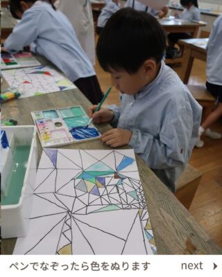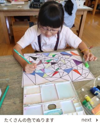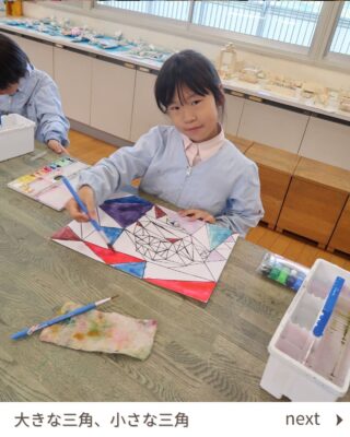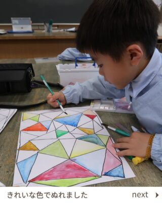 授業 681.図工「さんかくがいっぱい」(2年生) 2024年7月25日 2024年8月1日 2年生の1学期最後の図工は、「さんかくがいっぱい」の制作でした。 画用紙いっぱいに、いろんなサイズの三角をつなげていき、色をぬりました。 となりあう三角は同じ色にならないようにして、カラフルにしあげます。 作った色を見せ合ったり、色の配置を考えたり、児童は楽しみながら作品をしあげました。