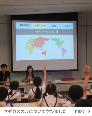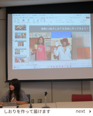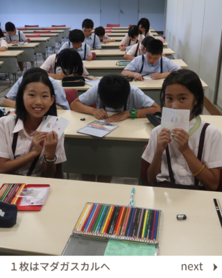 マダガスカルの子どもたちに届ける本に、手作りのしおりを一緒に渡したいということで、本校の4~6年生が協力することになりました。昨年に引き続き、2回目の参加です。まずは嘉藤さんをはじめとする関西学院大学の栗田ゼミの学生さんから、マダガスカルという国や「BOOK FOR CHILDREN」の活動内容について教わりました。