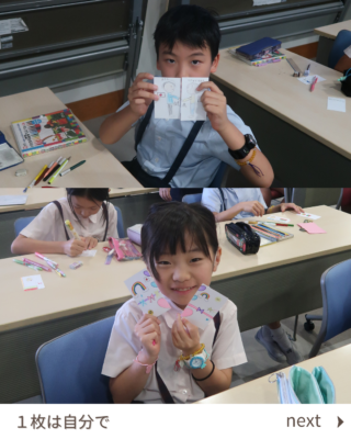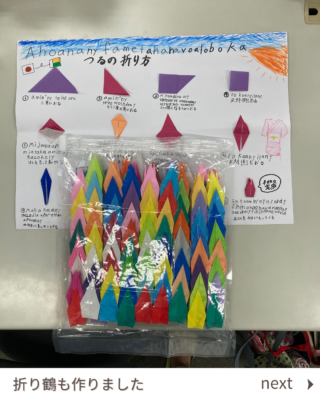 また、日本の折り紙が喜ばれると聞いて、5年生の有志の児童が、折り鶴とその作り方を書いて、一緒に届けてほしいと嘉藤さんに託しました。喜んでもらえるといいですね。