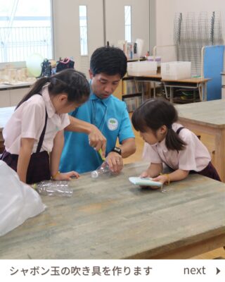 その他 688.夏休み児童預かり「シャボン玉作り」 2024年8月4日 2024年8月31日 夏休み中もキッズアフターカレッジがあります。利用する児童は朝から元気に登校してきます。 この日は午後からシャボン玉作りをしました。ペットボトルやモール、うちわなど自分の好きな材料で吹き具を作ります。液も作って、外でみんなで飛ばしました。 みんな、楽しそうに過ごしていました。