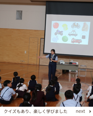 行事 720.交通安全教室 2024年10月16日 2024年10月17日 交通安全教室を実施しました。 奈良県警察本部の警察官がお越しくださり、低学年には歩くときに気をつけること、高学年には自転車に乗るときに気をつけることをお話してくださいました。また、VRを使って、道路上でどのように行動すればよいかを疑似体験できました。今日学んだことをこれからの生活にいかしていきましょう。