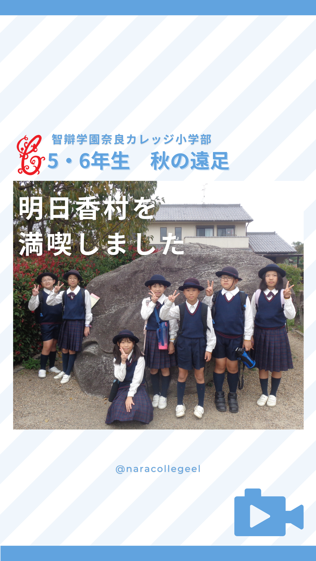 行事 725.秋の遠足(5・6年生) 2024年10月30日 2024年11月8日 5・6年生が秋の遠足で明日香村に行きました。 飛鳥資料館で飛鳥の歴史について学び、飛鳥寺で日本で一番古い大仏様を拝み、石舞台古墳の大きさに驚いていました。 午後からは縦割り班ごとにオリエンテーリングをしながら明日香村の景色を楽しみました。 たくさんの学びを得た一日となりました。 ※この記事の動画はInstagramにてご視聴いただけます。上の画像をクリックしてください。