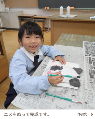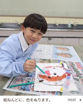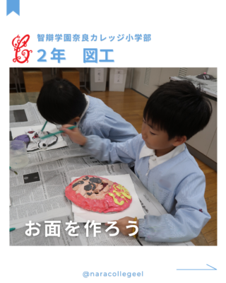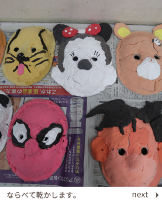 授業 735.図工「お面をつくろう」(2年生) 2024年11月16日 2024年11月22日 2年生が図工の時間に、お面づくりをしました。お面のパーツに紙粘土をつけて、動物やキャラクターなど好きな形を作ります。絵の具で色をつけて、ニスを塗ったら完成です。