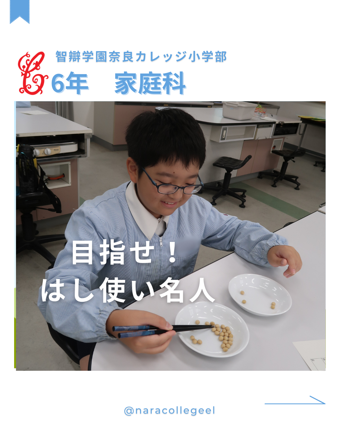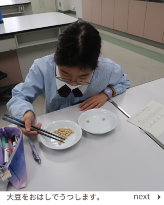 授業 736.家庭科「目指せ!はし使い名人」(6年生) 2024年11月18日 2024年11月22日 はし使い名人の大会をしました。お皿に入った大豆をおはしで別のお皿にうつします。先輩の記録を抜いた児童もおり、みんな集中してがんばりました。