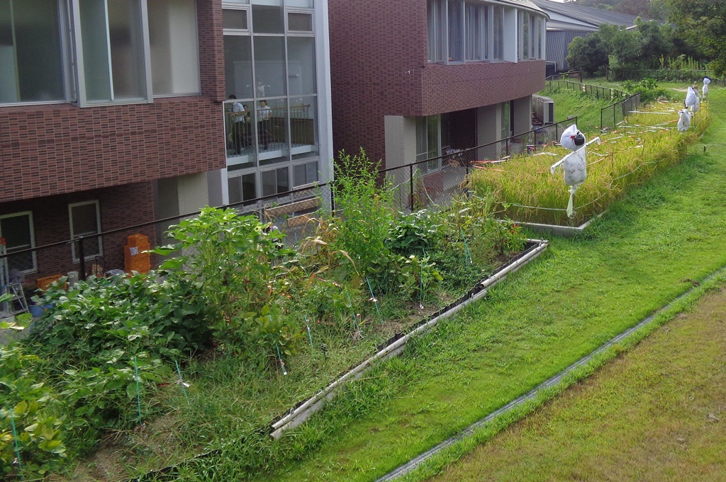 直径90mの円形校舎。その内側は憩いの広場と呼ばれる天然芝を敷き詰めた校庭となっている。