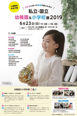 お知らせ 6月23日(日)開催 私立・国立幼稚園&小学校展2019にブース出展します ※終了しました 2019年06月25日 2019年06月26日 ※本イベントは終了しました。多数のご参加ありがとうございました。 日時:2019年6月23日(日) 場所:イオンモール大和郡山2階 イオンホール(大和郡山市下三橋町741) 内容:ブースによる学校紹介や相談 入場は無料で、申込も不要です。学校の様子や様々な質問に答えます。皆様のご参加をお待ちしています。 上の画像をクリックするとPDFが開きます