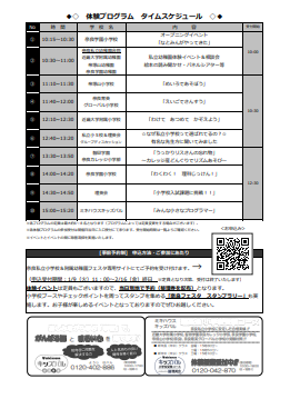 お知らせ 「奈良私立小学校&附属幼稚園フェスタ」に参加します 2024年01月15日 2024年01月15日 2024年2月18日(日)、近鉄百貨店奈良店にて開催される「奈良私立小学校&附属幼稚園フェスタ」に本校も参加します。 奈良の私立小学校、附属幼稚園の教員と直接お話をすることができる他、体験プログラムもございます。 本校の体験プログラムは「『うっかりリスさんの忘れ物』~カレッジ産どんぐりでリズムあそび~」です。 私立小学校にご興味のある方、お近くにお住まいの方はぜひお越しください。 詳細、事前予約のお申し込みについては、下記チラシをご覧ください。