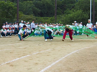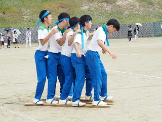 5人で一足の下駄を履く「ムカデ競争」は,呼吸を合わせることが大切。