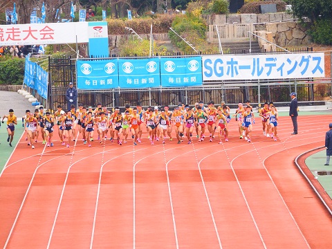 クラブ紹介もかねたクラブ対抗リレーは,各種ユニフォーム姿などで走ります。