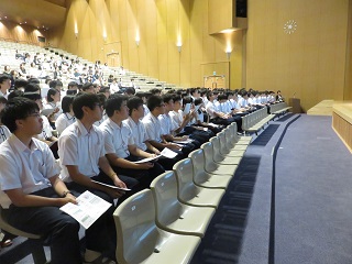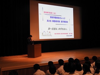 その他 高3生・保護者対象 進学講演会 2016年7月3日 2016年7月3日 平成28年7月2日(土)に,高3生と保護者を対象とした進学講演会が行われました。講演で講師の先生は受験に対する心構えや取り組み方についてお話し下さいました。 今回講演して下さったのは駿台予備学校 西日本教育事業部の大草敏弘先生です。 受験まで残すところあと半年,高3生たちは熱心に講演に聞き入ります。 保護者の方も多数ご参加下さり,最後に学年主任から挨拶がありました。