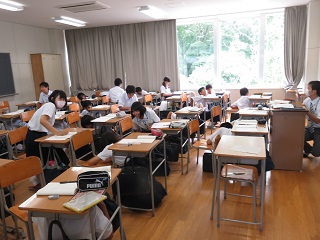 その他 ナラ・シェイクアウト 2016年7月18日 2016年7月18日 7月9日の「奈良県地震防災の日」を受けて,平成28年7月14日に地震からいかに身を守るかの確認を行う「ナラ・シェイクアウト」(奈良県一斉地震行動訓練)が実施されました。地震発生の訓練放送に合わせ,生徒は安全確保訓練をしました。終了後,緊急時備蓄食糧等の確認を行いました。 放送が入り直ちに安全確保開始です。 安全確保完了しました。