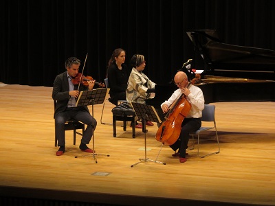 その他 「陽子フォゥグとその仲間たちによる室内楽」鑑賞会 2016年11月10日 2016年11月10日 11月7日(月)「陽子フォゥグとその仲間たちによる室内楽~ウィーンの薫り~」を開催しました。今年の曲目は,ハイドンの『弦楽三重奏曲』,『ピアノ三重奏曲・ハ長調』,ラヴェルの『ピアノ三重奏曲』より第2楽章「パントーム」でした。フォゥグ夫妻とその友人が,奏でる音色で生徒や参加した保護者を魅了しました。