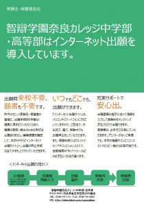 その他 奈良カレッジではインターネット出願を導入しています 2017年6月3日 2017年6月3日 奈良カレッジ中学部・高等部は,昨年度からインターネット出願サービスを導入しています。 今年もすでに説明会や見学会の予約を自宅のパソコンやスマートフォンなどによりご登録いただいております。今後,プレテストや入学試験の出願,さらには合否の照会や入学金の決済も手軽に行っていただけます。概要を以下に掲載いたしましたが,各手順の詳細はその都度本校ホームページご覧いただけるようになります。 <画像をクリックすると拡大します>