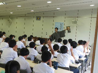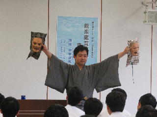 その他 中3能楽鑑賞教室事前学習 2017年9月22日 2017年9月22日 先日、中学部3年生を対象に能楽鑑賞教室事前学習が行われました。講師には金春流の金春穂高先生をお招きし、能楽について学びました。先生は能楽の芸術性について謡、道具(面・扇など)、歴史などを通じて生徒たちに興味深く説明してくださいました。当初、能楽はわからないと言っていた生徒たちでしたが、講義中は興味津々、まだ見ぬ能楽の世界に魅せられたようでした。「『能は楽しむものである』。能楽を見ることは非常に良い経験となり、君たちの人生の糧となるだろう。」と先生はおっしゃいました。生徒たちは先生からの熱いメッセージを受け取り、9月24日(日)に『奈良国際フォーラム甍』で行われる能楽鑑賞教室に臨みます。