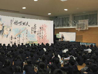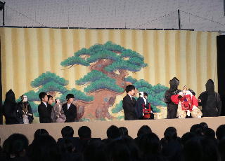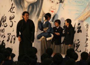 学校で実施したため,本校生徒の出番も多く,太夫体験や人形つかい体験に多くの生徒が参加できました。後半は,淡路人形座の方々による『本朝廿四孝 奥庭狐火の段』が演じられ,生徒・保護者ともに本物の人形浄瑠璃をじっくりと鑑賞できました。