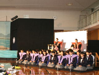 | 体育館の特設舞台 | 中2生徒25名の太夫体験 |