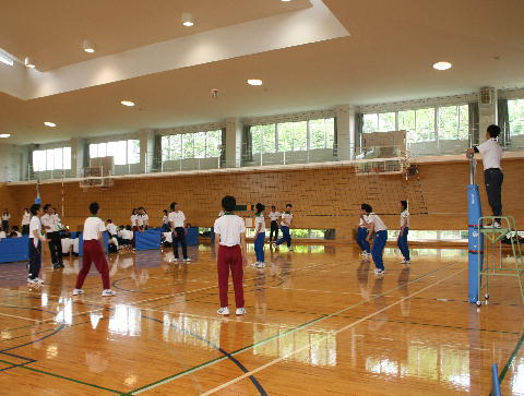 | 開会式は第一体育館で行われ,審判長から体調管理とフェアプレイについての諸注意がありました。 | 男女ともバレーボールは第一体育館で行われました。体育館だけに歓声がすごく響きわたります! |