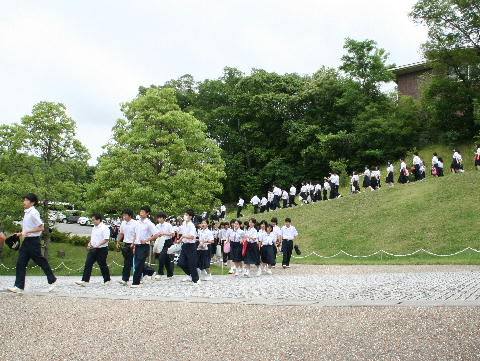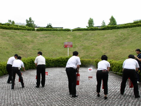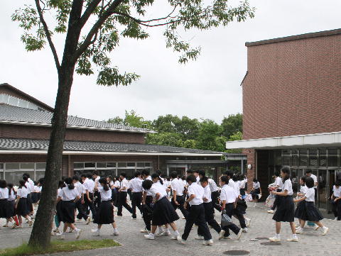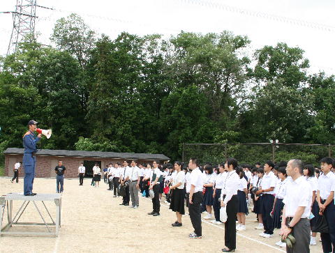毎年,香芝消防署の協力を得て,小学部・中学部・高等部の3つの校種が共同で防火避難訓練を実施しています。この訓練では,自動火災警報装置や緊急放送を用いる中,各一次避難場所への避難行動がとられました。避難に関する諸注意は,事前に担任の先生から受けています。避難完了後,それぞれ消防署の方から講評をいただき,火災発生時における注意点などをお伺いしました。そして,避難訓練終了後のホームルームでは,各クラスにおいて火災や地震などを含めた,災害発生時の対応についても話し合われました。また,ホームルームをしている間,教職員の消火訓練も実施されました。これらの訓練は,例年4月末か5月初旬に実施しますが,天候不順により,今年は6月11日(月)に実施されました。