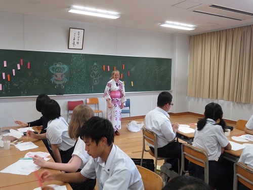 水性ペンインクと割り箸を用いた団扇の絵付けの授業。最後は浴衣体験のサプライズも!