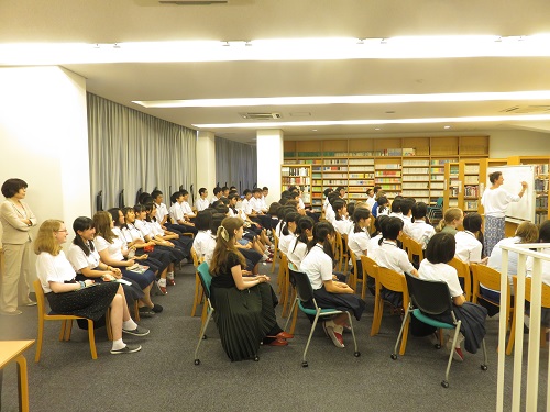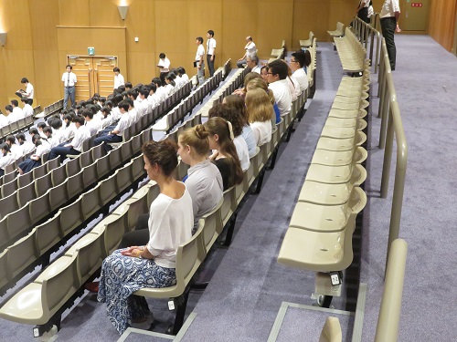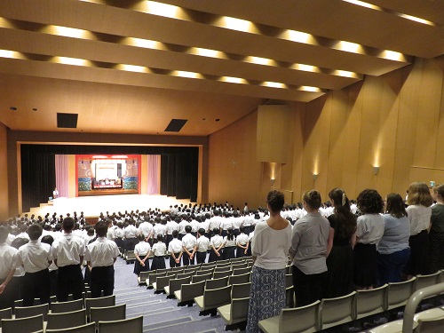 留学生は講堂で毎月行われる感謝祭にも参加しました。理事長先生のお諭しを受け,校歌も一緒に斉唱しました。
