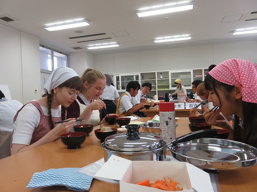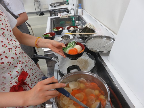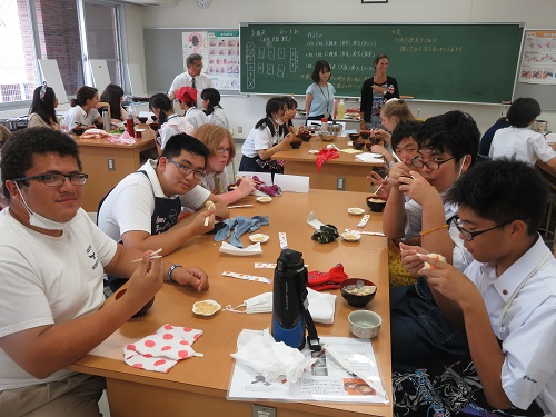 17日(火)に,留学生を交えての餅つきが行われました。そして,その餅を使って,各地特有のお雑煮(奈良・大阪・東京風味)を留学生とホストの生徒たちで作って食べました。デザートには寒天も作りました。箸を上手に使う留学生も多く,驚きです。