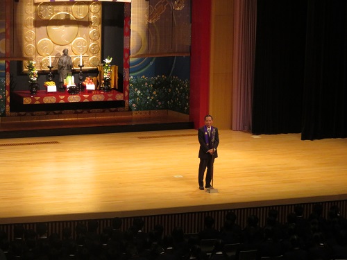 感謝祭では,先月遷化(せんげ)された弁天宗大森管長猊下をお祈りする般若心経3巻をお唱えし,管長猊下のご冥福を祈る黙祷を全員で行いました。その後,理事長先生のお諭しがあり,勇退された和歌山智辯の高嶋前野球部監督にまつわるエピソードを紹介してくださいました。