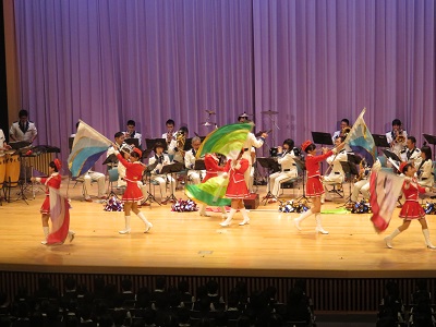 | テンポの良い音楽に生徒もリズムに合わせます。 | カラーガード隊の登場で会場は盛り上がります。 |