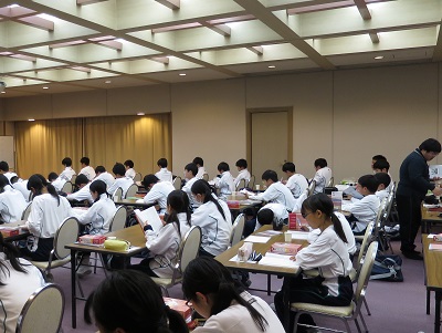 | 合宿初日、全体でのオリエンテーションが行われます | さっそく毎日の家庭学習についての実践練習です |