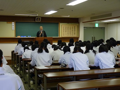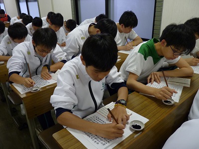 | 道場長様の講話に聴き入る生徒達 | 静寂の中で一心に般若心経を写します |