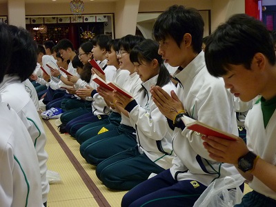 奈良カレッジの高等部1年生が,辯天宗茨木本部で2泊3日の錬成会に参加しました。この行事は,高等部1年の恒例行事で,普段の学校生活から離れ,規則正しい質素な生活を送るものです。これによって,本学園が大切にしている相互礼拝・相互扶助の精神を学び,人やモノに感謝する姿勢を育みます。今年は5月13日~15日に実施され,兄弟校である智辯学園高等学校や智辯学園和歌山高等学校も時期を前後して実施しました。
