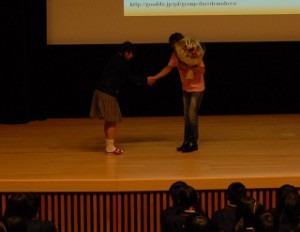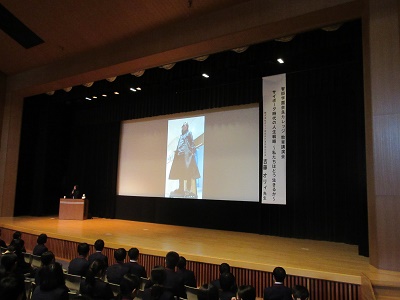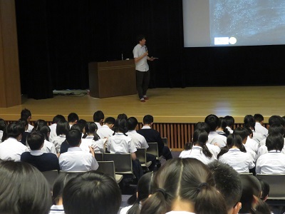 | 越智先生のご講演です。 | 越智先生は,ゲスト(助手学生さん)とともに,わかりやすい内容でお話し下さいました。 |