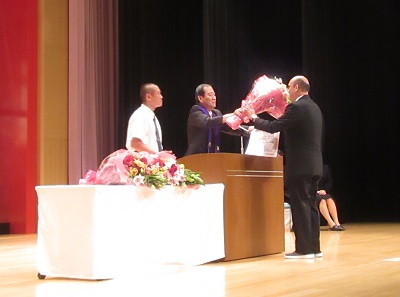 | 陸上部キャプテンが代表して表彰状を受け取りました | 永年勤続表彰の花束と記念品を受け取る先生 |