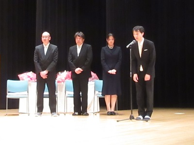 | 先生方のプロフィールを紹介する理事長先生 | 表彰者を代表して謝辞を述べる先生 |