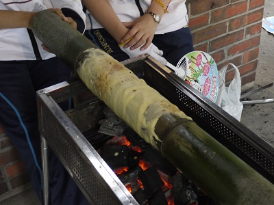 | 青竹を用いた「炭火焼き」バームクーヘン作り体験(左・右) | |
