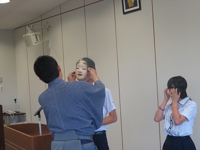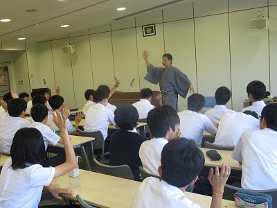 その他 能楽鑑賞教室事前学習会 2019年9月11日 2019年9月12日 9月10日(火)に高等部1年生を対象として,特別講師に金春流能楽師の金春穂高先生をお招きし,能楽鑑賞の事前学習会を行いました。能楽の歴史の話をはじめ,実際に使われる面などを使って,髪結いの状態を見せてくださったりと,大変面白い学習会となりました。今回の講演を事前学習として,9月22日(日)に『奈良国際フォーラム甍』での能楽鑑賞を予定しています。