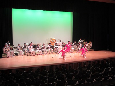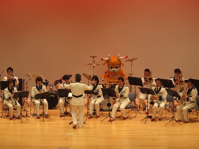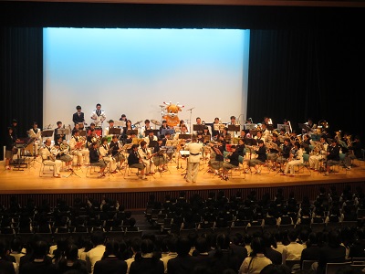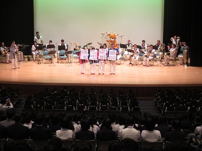 | 演奏中には交通安全の啓発活動も行われました。 | 最後に本校ブラスバンド部も加わり,会場は一層盛り上がりました。 |