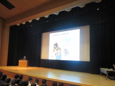 | 県警生活安全部少年課の泊里さんによるSNS講習です。 | 真剣なまなざしで生徒たちも話に聞き入っていました。 |