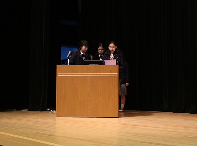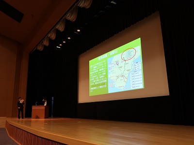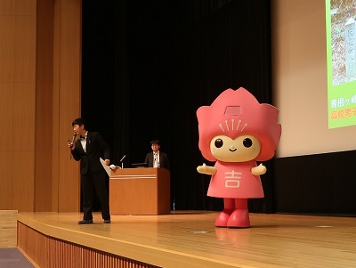 説明会では,社会研究部の歴史的な解説に続き,担当の先生からコースの概要が説明され,生徒たちは熱心に聞き入っていました。そして最後に,吉野町のマスコットキャラクター「ピンクルちゃん」が登場し,会場は驚きと笑いの渦に包まれていました。