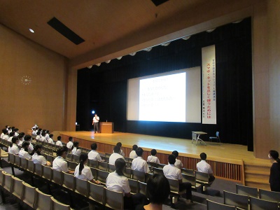 行事 中学生対象の人権講演会 2020年9月10日 9月9日(水)中学生対象の人権講演会を開催しました。NPO法人 なら情報セキュリティ総合研究所理事長の 日置 慎治 先生に講師をお願いし,「スマホ・ネットを正しく使うには」と題して,スマホとネットの危険性についてお話しいただきました。約1時間の講演でしたが,具体的な内容が多く,中学生にとてもわかりやすいものでした。生徒...