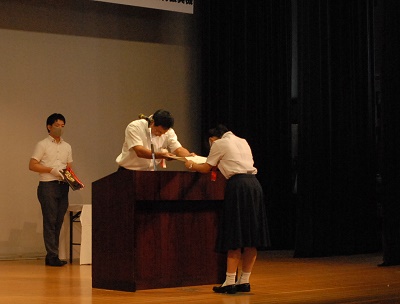 | 中学3年生の三輪さんの発表 | 表彰式の様子 |