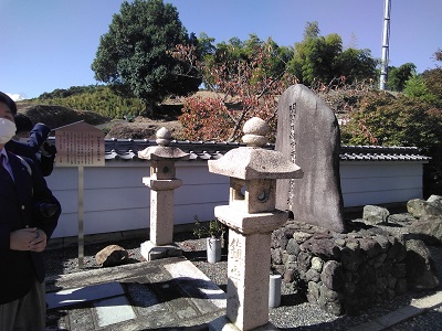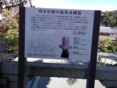 | 「『仁王さんのへそ石』を発掘調査したら・・」の清水寺境内の内務省地理寮の標石を発見! | 今話題の明智光秀。その「明智日向守光秀公供養塔」の前で調査中。この前には本能寺,そしてこの後,明智藪と光秀の塚を訪れ,光秀の謎に迫ります。 |