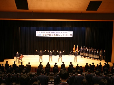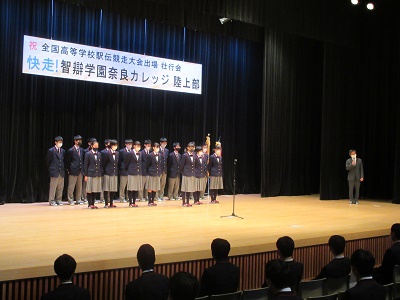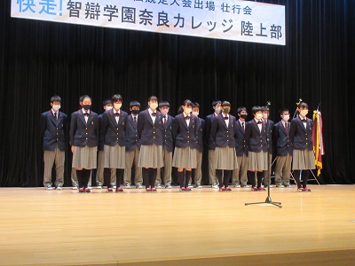 12月11日(金)駅伝全国大会に出場する奈良カレッジ陸上部の壮行会が講堂で行われました。今回の壮行会は,新型コロナウイルス感染症対策のため,高等部の生徒のみが直接参加し,小学部児童や中学部生徒は各教室においてリモート参加となりました。