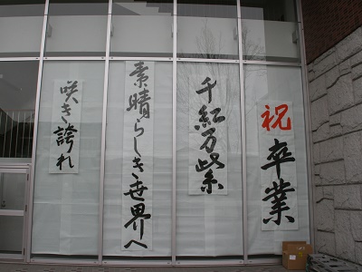 | 卒業生の退場です。 | 校舎に張り出された卒業生へのメッセージ |