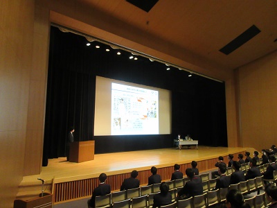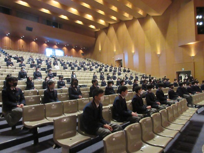 教養講座は,例年大学の先生や各分野で活躍されている専門家の方々をお招きして,中学1・2年生がグループに分かれて講演会や体験会に参加するものです。ただ今年は,コロナウイルス感染拡大防止の観点から,例年の形ではなく講堂を利用した講演会としました。そして今回は,奈良カレッジを卒業して社会において活躍している卒業生から,現在の仕事内容やそのやりがいについて,直接話を聞くことができる会としました。先輩たちの奈良カレッジ在籍当時のエピソードなどを含め,生徒たちは話に熱心に耳を傾けていました。さらに教室に戻ってからは,オンラインで別室にいる先輩と繋いで,対話や質問ができるようにしました。平日にもかかわらずこのようなイベントに協力してくれた卒業生に感謝する共に,生徒自身の仕事観の育成や将来の目標達成のヒントを得る一助となればと考えます。
