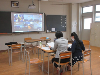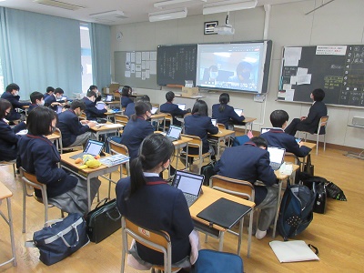 | オンラインで生徒たちに語りかける卒業生 | 教室で先輩からのアドバイスを聞く生徒たち |