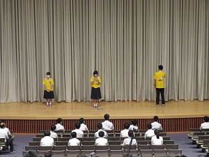始業式から今週初めまで,感染症拡大防止のための特別校時を実施していたため,生徒たちには,少ない時間を最大限に活用しての準備でした。このことについて,校長先生は開会の挨拶で,録画したものであっても,舞台上での発表であっても,その努力や苦労は変わりがないので,そのことを意識して鑑賞して欲しいと話されました。